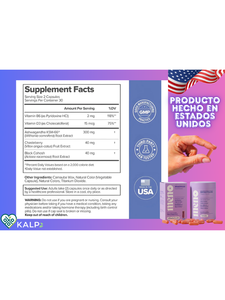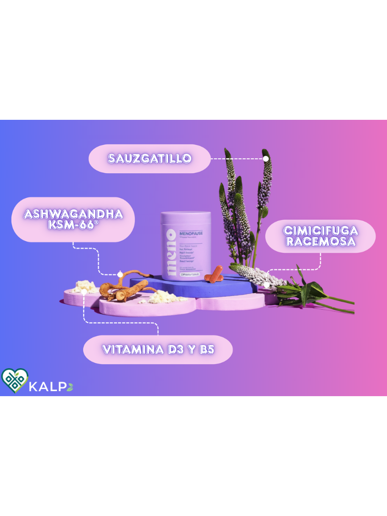 Con Ashwagandha KSM-66®, Cohosh Negro (Cimicifuga Racemosa), Chasteberry (Vitex agnus-castus) y Vitaminas D3 y B6, que actúan en sinergia para aliviar los síntomas de la menopausia y promover un estado de ánimo positivo.